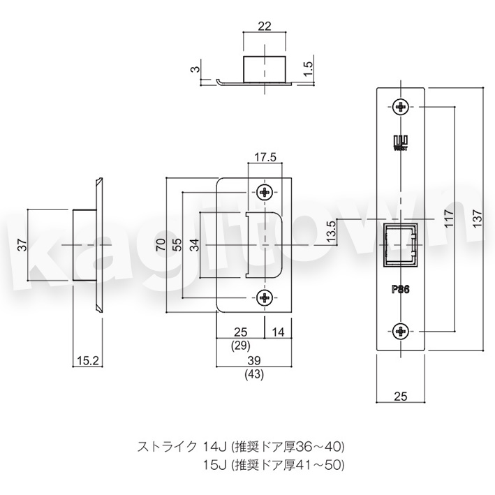 WEST 【ウエスト】ストライク[WEST-14J,15J]14J推奨ドア厚36〜40mm,15J推奨ドア厚41〜50mm [WEST-ストライク14J15J]